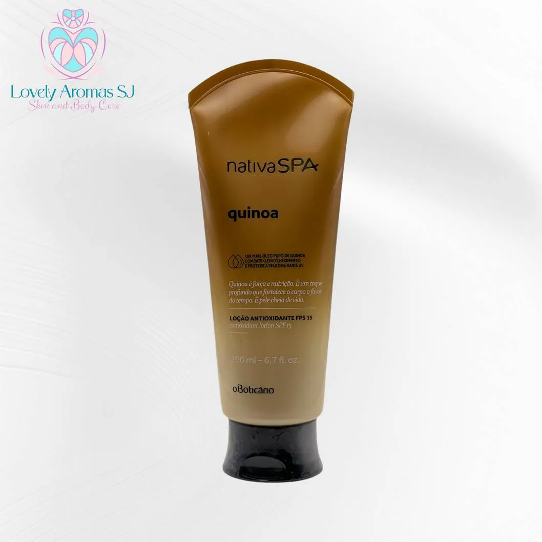 La Loción Hidratante Antioxidante Nativa SPA QUINOA FPS15, contiene antioxidantes, ácido hialurónico y vitamina E. Combate el envejecimiento y protege la piel de los rayos UV con SPF15, además de contener 10 veces más el aceite puro de quinoa, que combate el envejecimiento de la piel. Presentación: ...