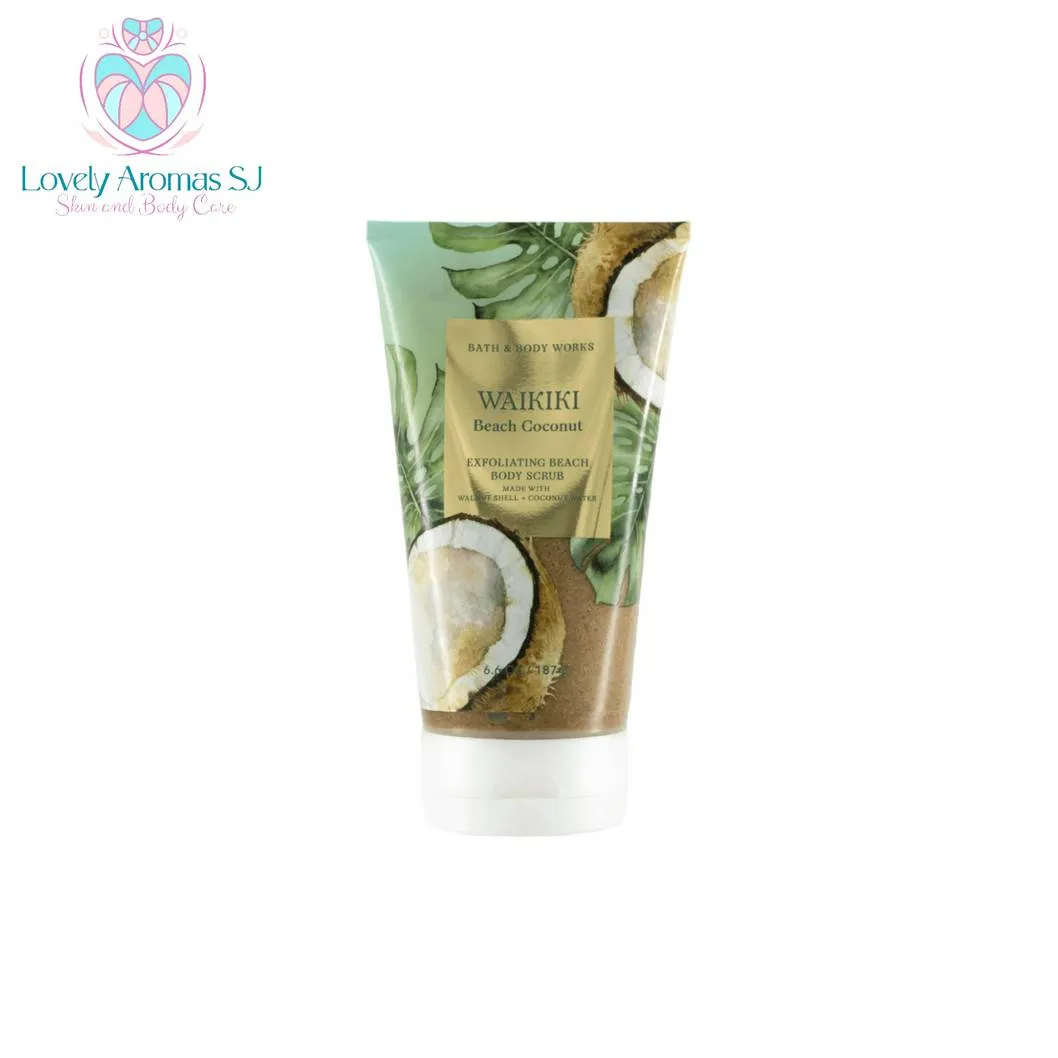 Exfoliante Corporal Bath & Body Works con las siguientes notas de fragancia: coco blanco tropical, brisas de agua salada y maderas blanqueadas por el sol.
